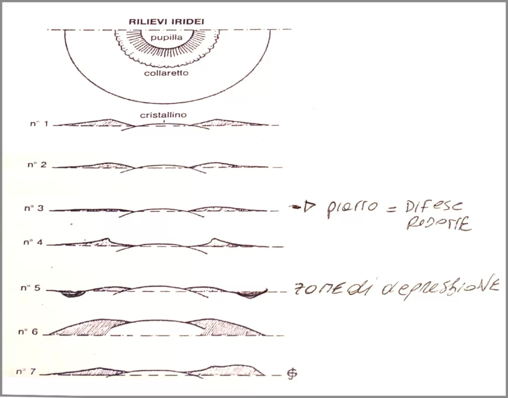 Secondo Gilbert* Jausas i rilievi 5,6,7 dello schema successivo ci parlano di una diminuita resistenza organica. Il rilievo ideale di un’iride normale in cui la forza vitale è equilibrata, secondo Jausas, è il rilievo numero 1. Nel rilievo numero 2, un passato patologico ha smussato il profilo, senza colpire sensibilmente la resistenza dell’organismo. Nel rilievo numero 3 siamo già di fronte ad una diminuzione delle difese. La diminuzione di vitalità aumenta nelle configurazioni 4 e 5, per arrivare alla configurazione numero 6 caratterizzata da iperattività funzionale del simpatico, e alla 7 riscontrabile in situazioni caratterizzate da patologie croniche.